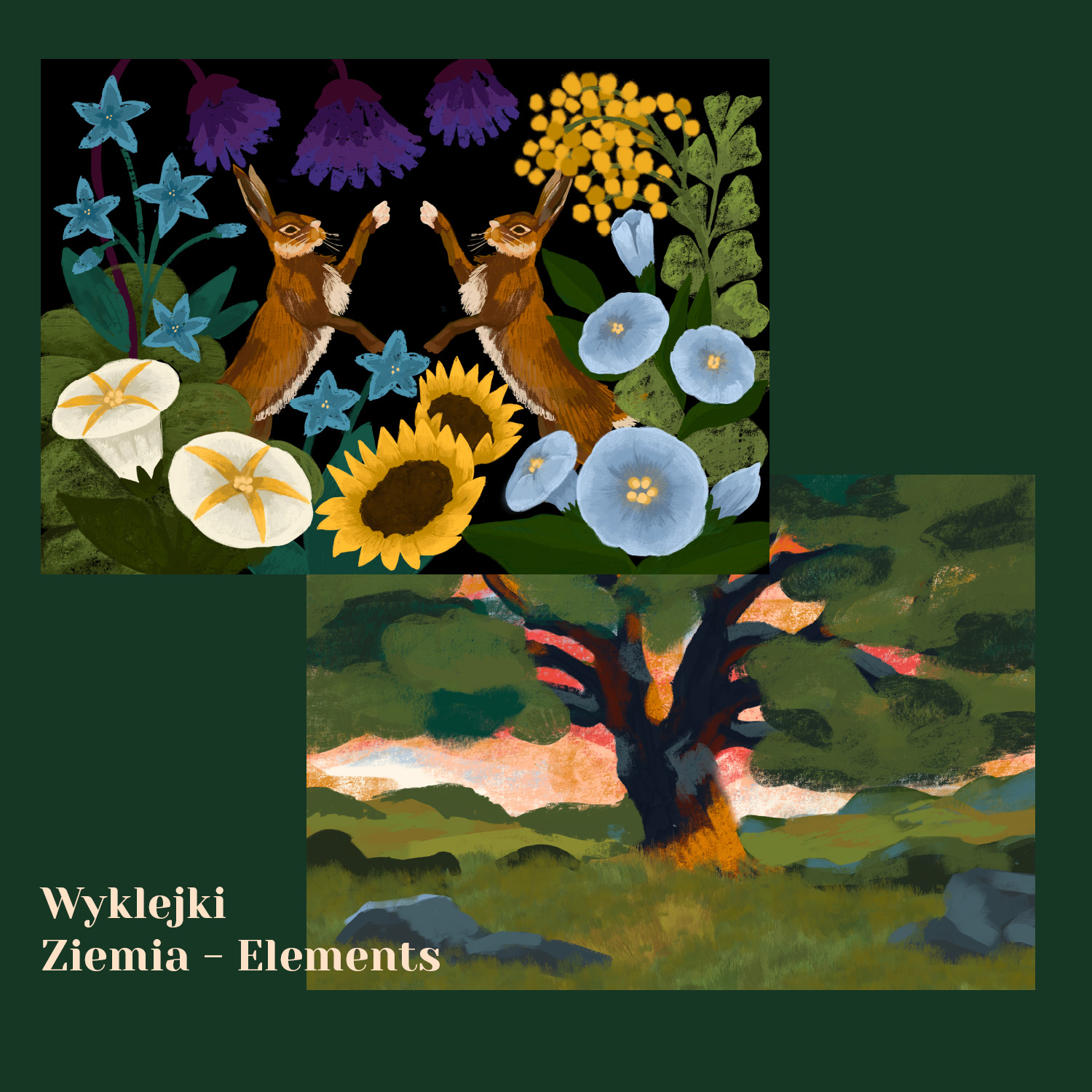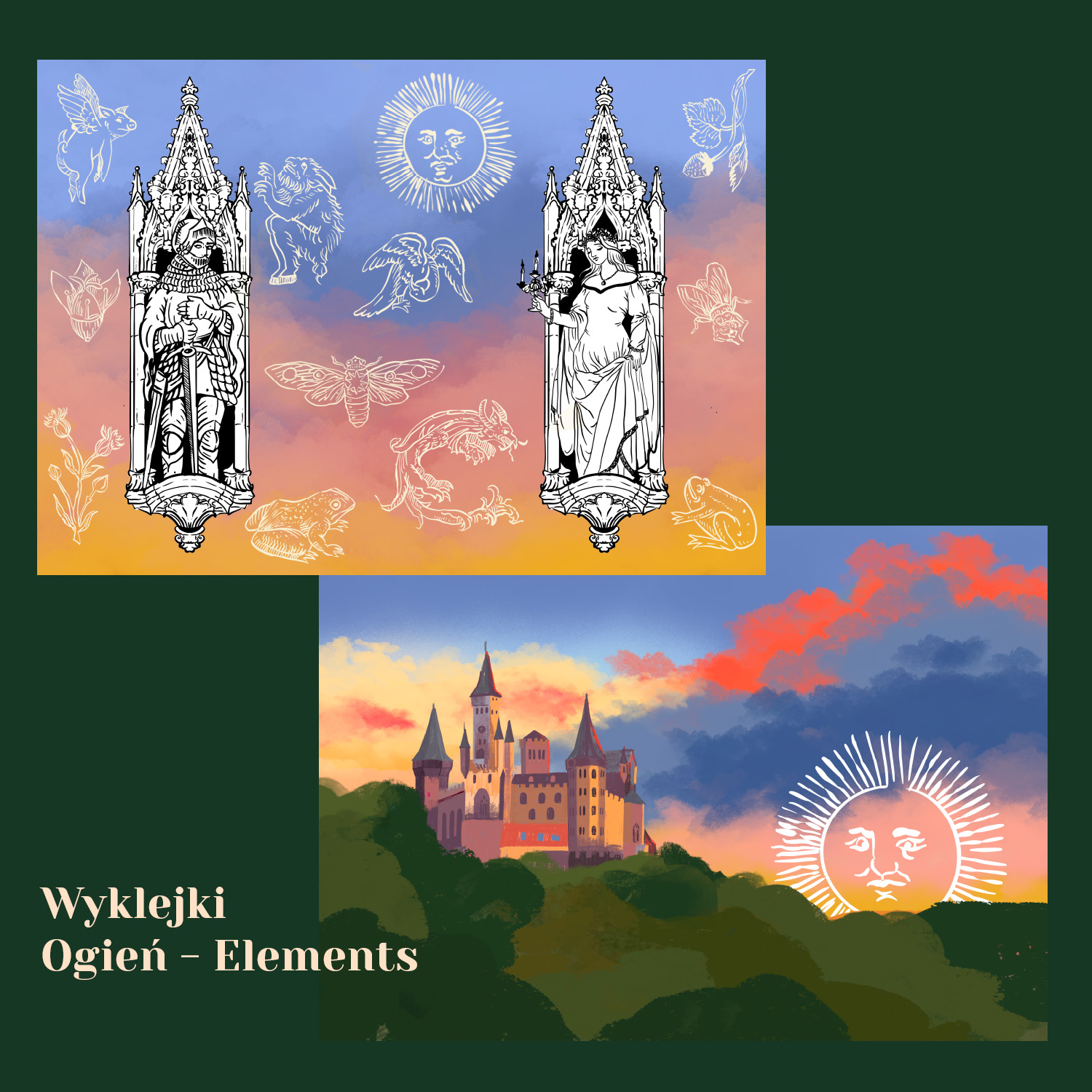 Elements: Ogień – z smokami, Woda z gwiazdami na granatowym tle, Ziemia z tańczącymi żuczkami i pszczołą, Powietrze  z róża wiatrów i mapą.