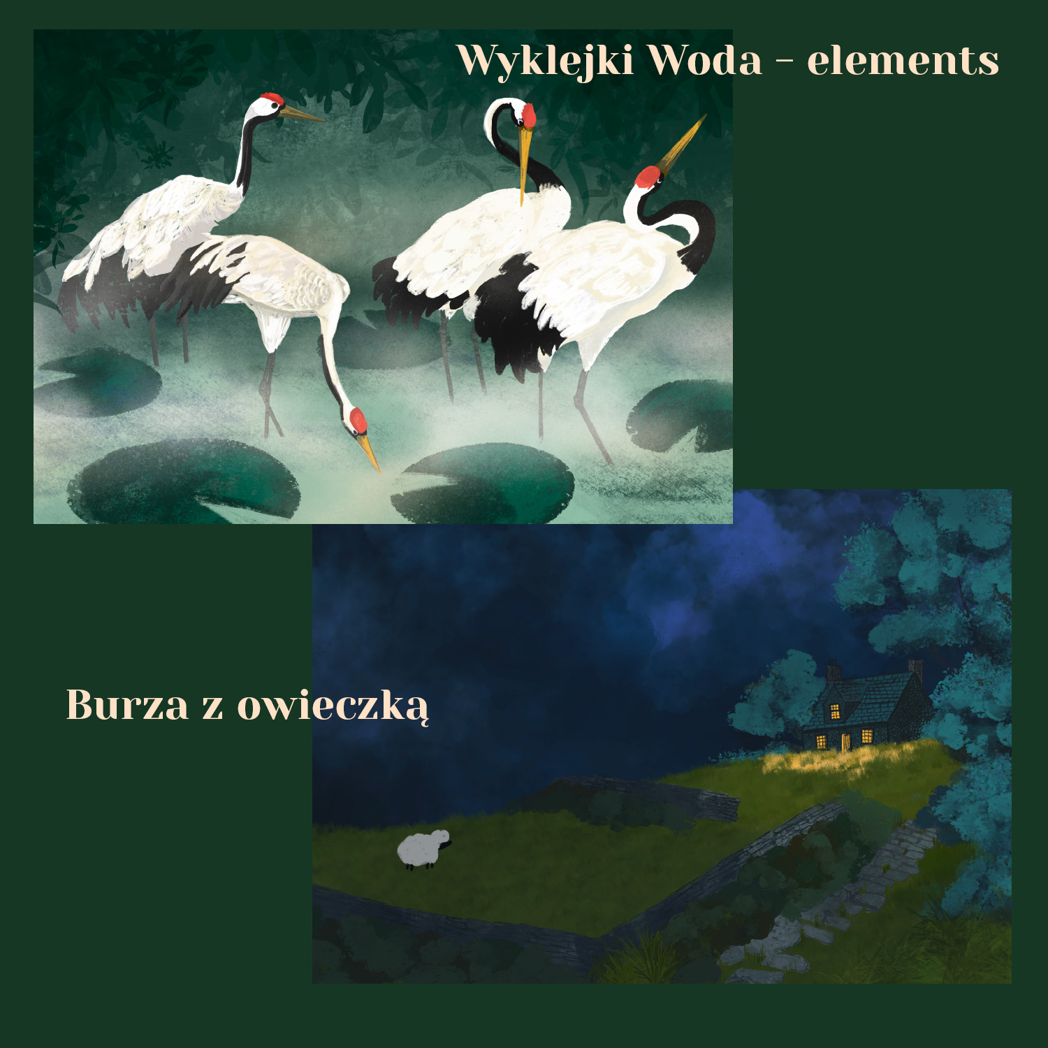 Wyklejki: Okno z księżniczką i rycerzem/ zamek, Żurawie/burza z owieczką, Zające z magicznymi roślinami/drzewo, Ptaki/ widok na las nocą.