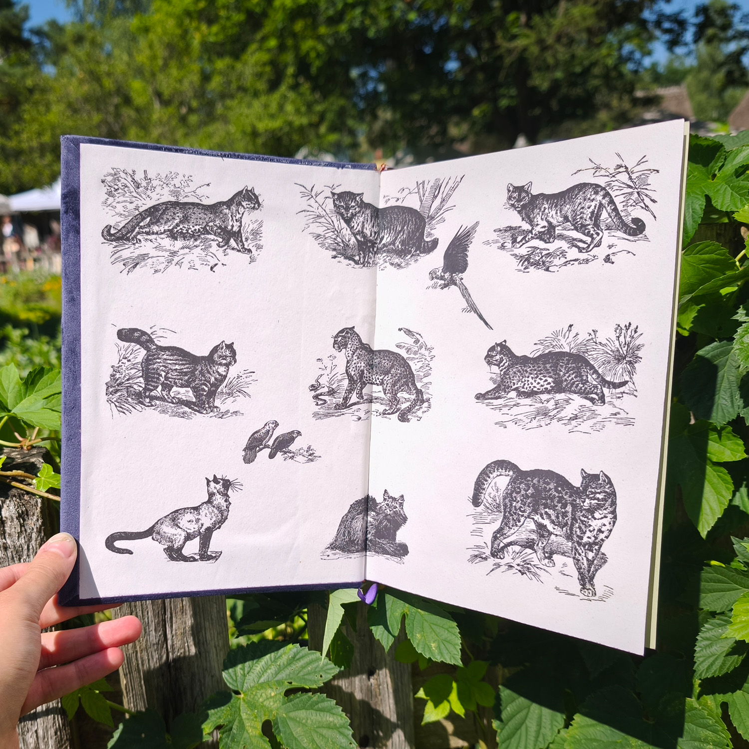 Na wyklejkach znajdują się kolorowe ilustracje kotów i innych zwierząt pochodzące z książek przyrodniczych z XIX wieku, które dodają notesowi unikalnego, klasycznego charakteru.