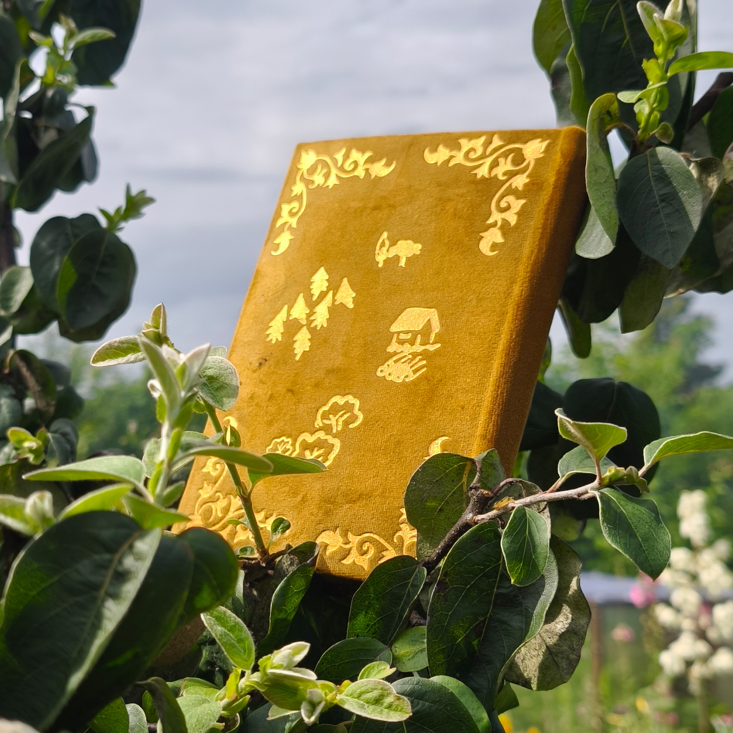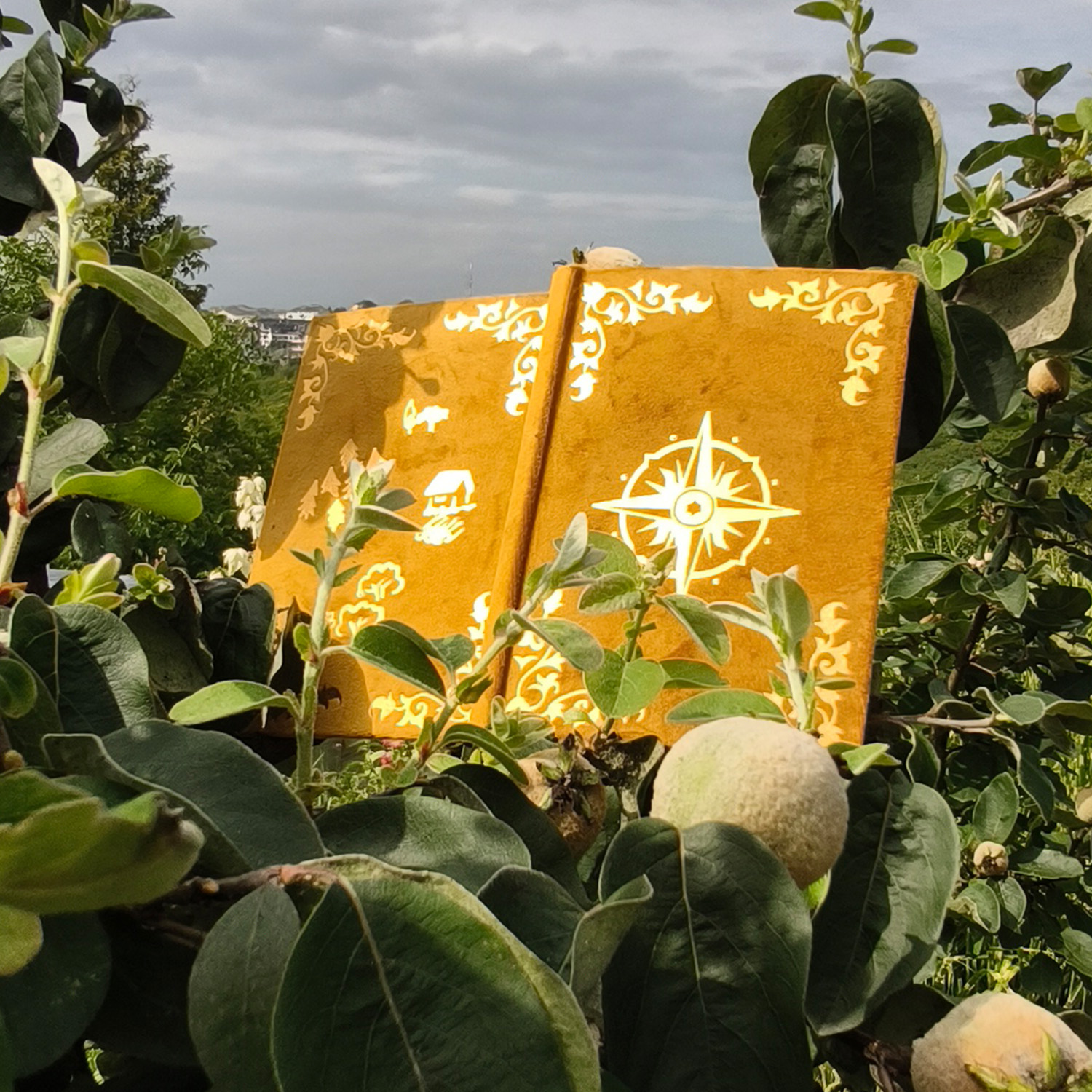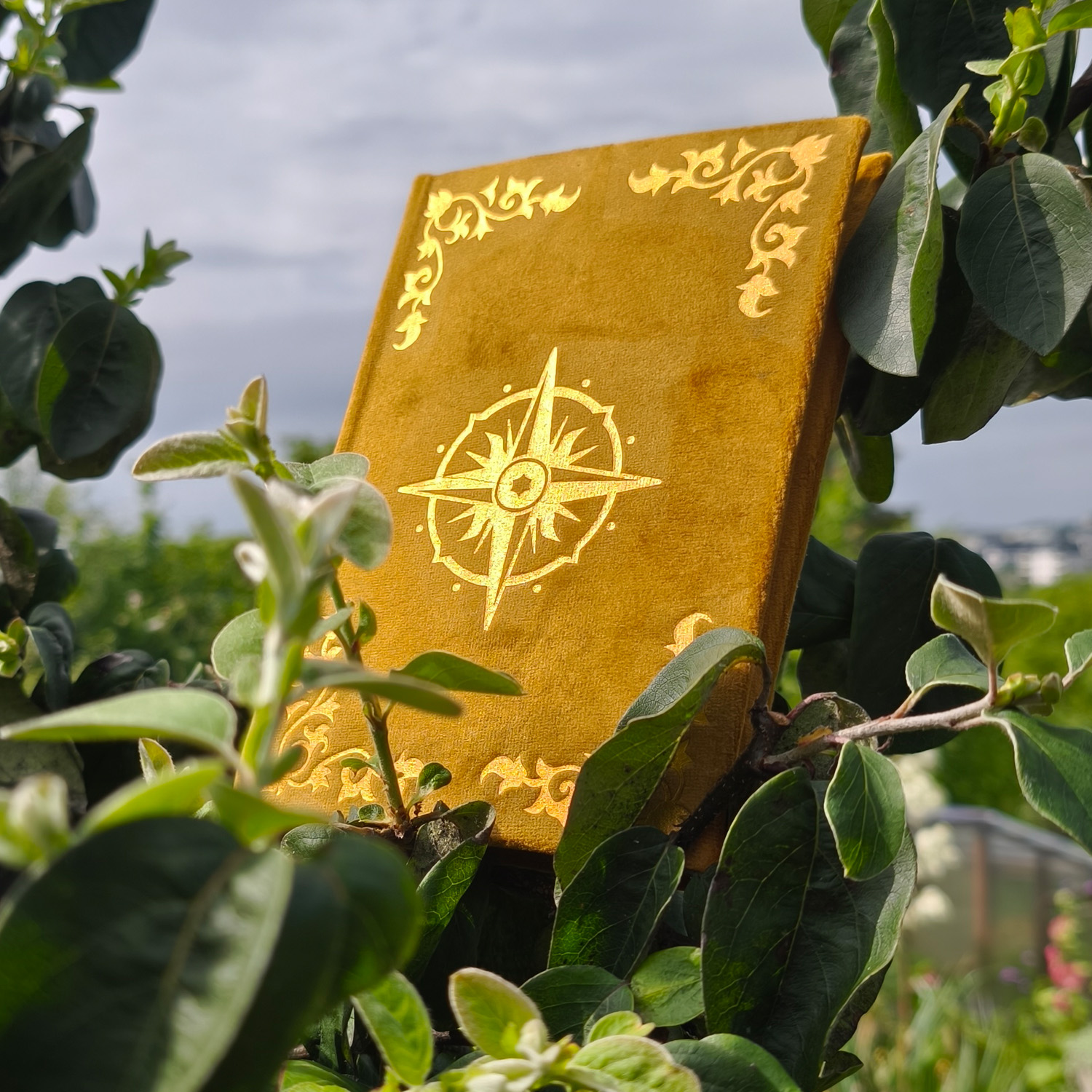 Ręcznie szyty notes w twardej, żółtej oprawie welurowej ze złoceniami Róży Wiatrów i mapy. Symbol lekkości, podróży i nowych początków – idealny do journalingu, afirmacji i zapisków marzeń.