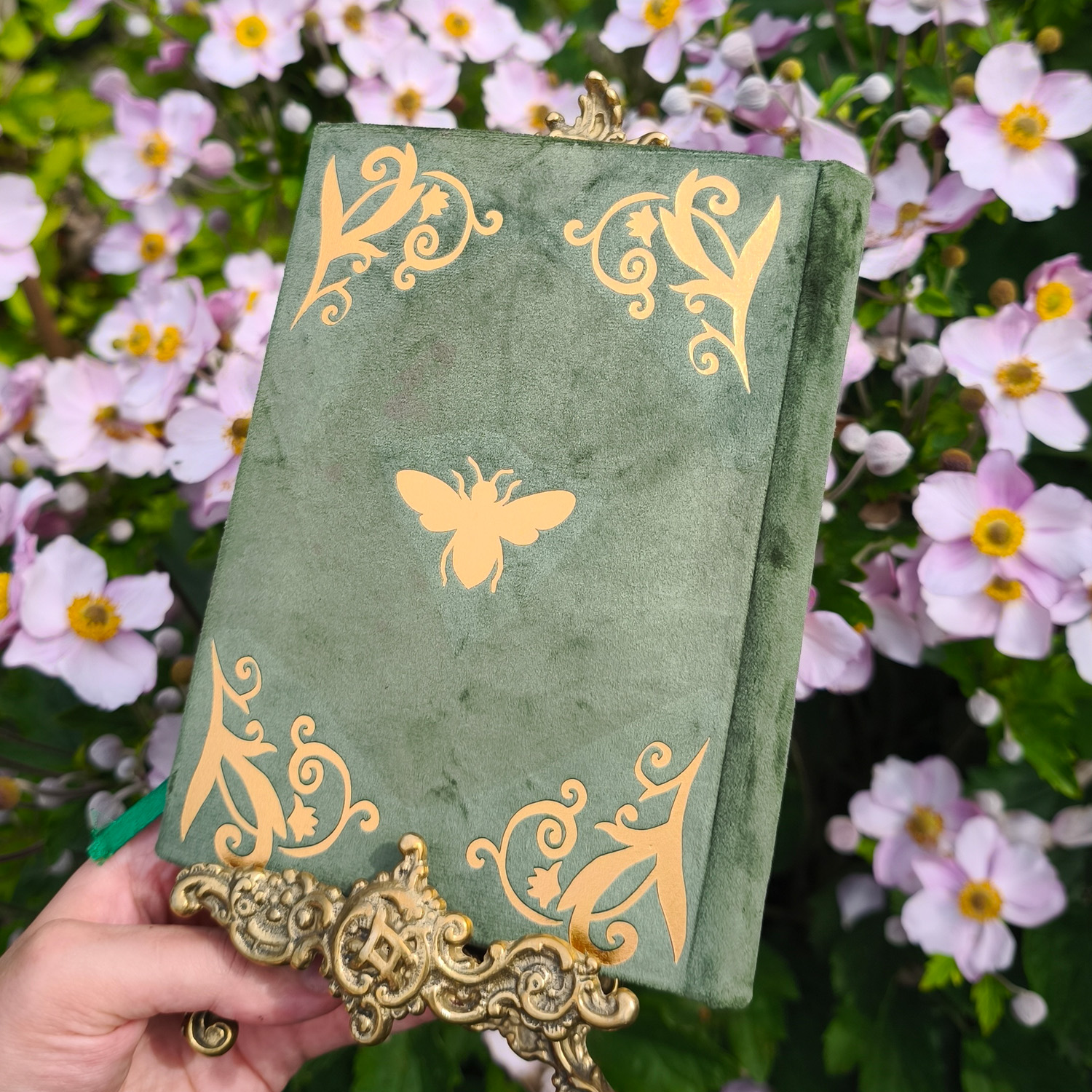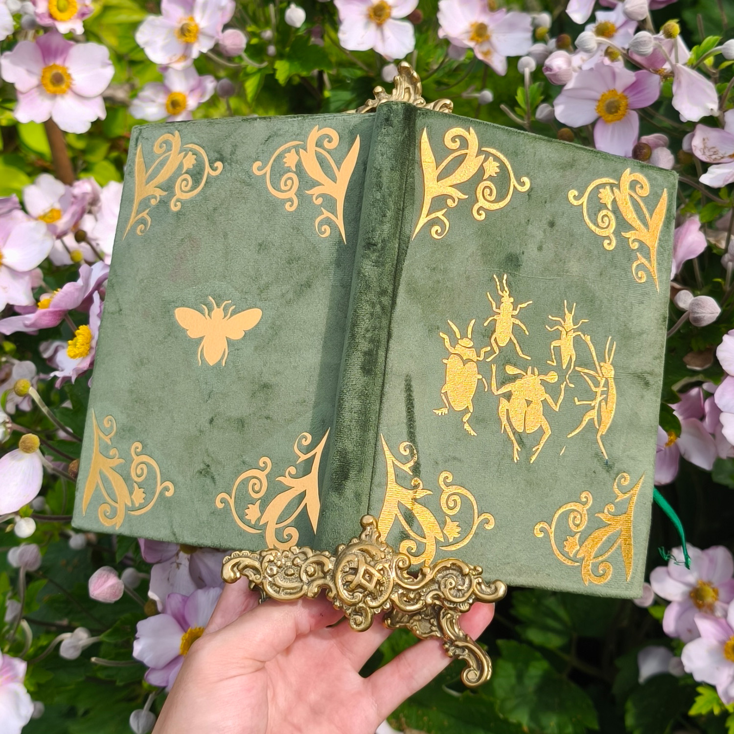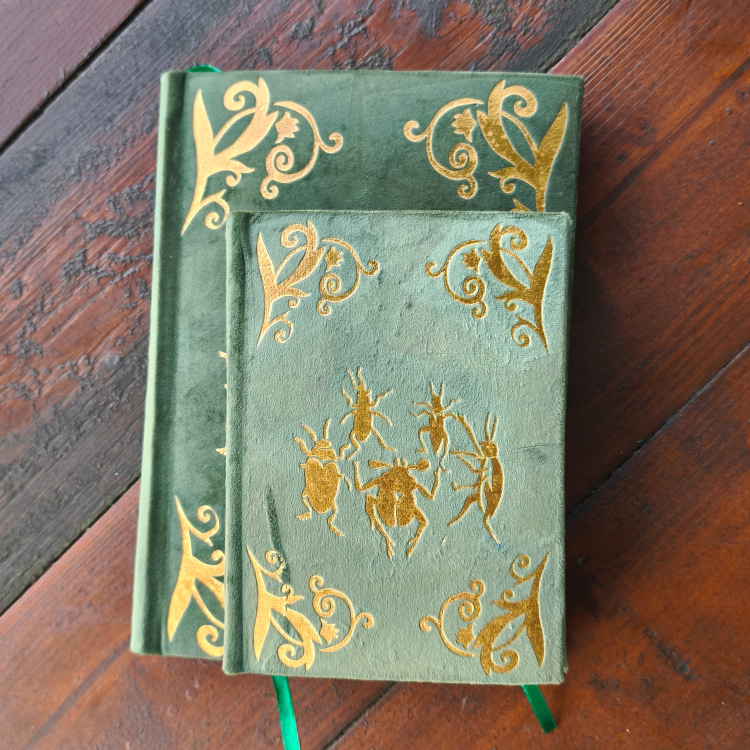 Zielona oprawa z weluru i złocenia przedstawiające wirujące owady – ten ręcznie szyty notes to hołd dla natury i codziennego spokoju. Doskonały do zapisków z obserwacji, dziennika wdzięczności i slow journalingu.
